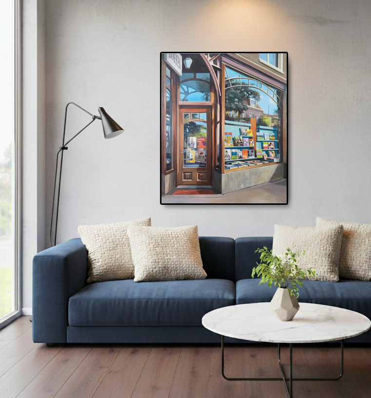 Een kleurrijke etalage van een klassieke boekhandel vol kunstboeken. gebaseerd op een pand dat ik tegenkwam in de historische binnenstad van Leiden.