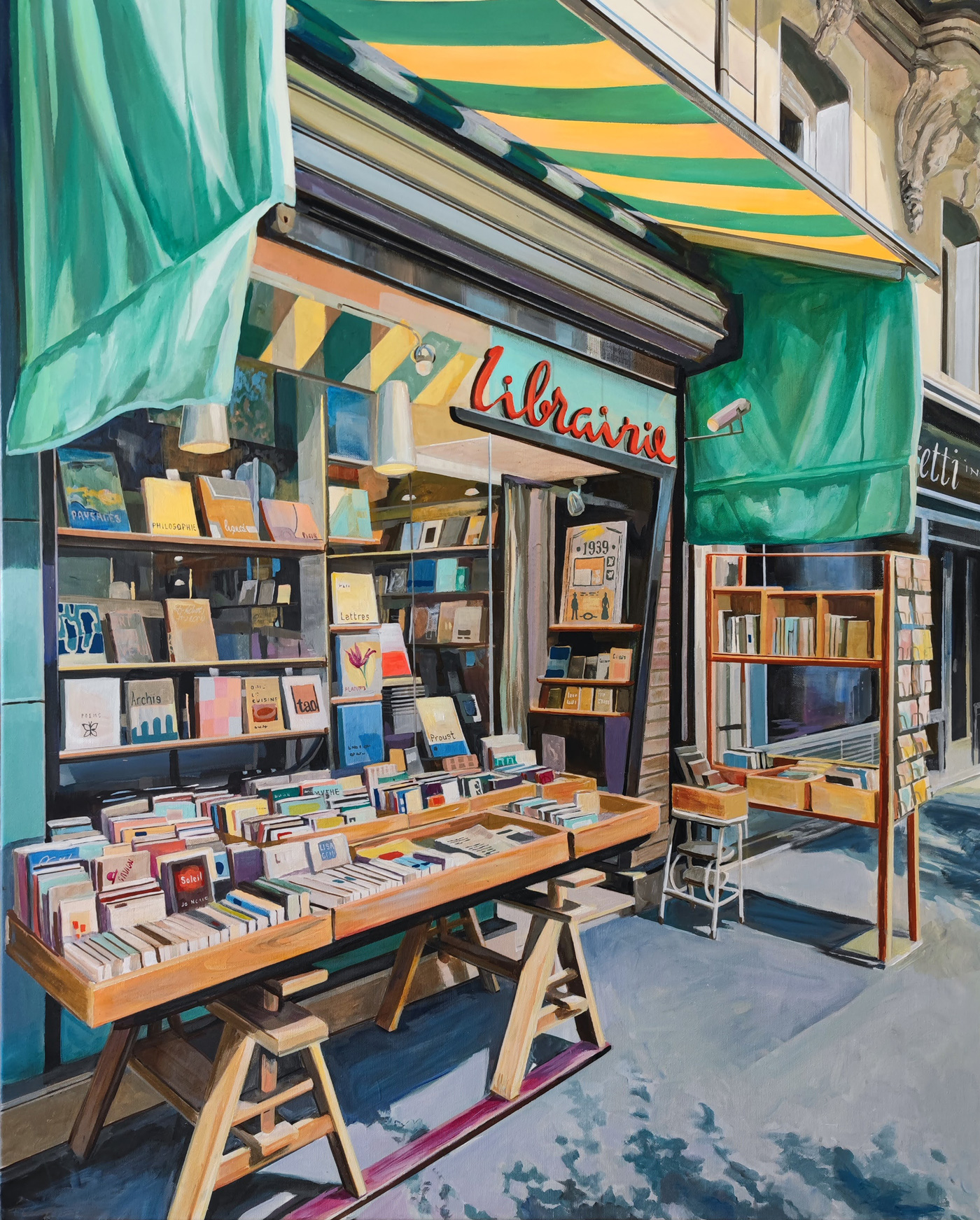 Een typisch Parijse boekwinkel: kleurrijk, binnen en buiten bomvol boeken, een uitnodiging om stil te staan en rond te dwalen.