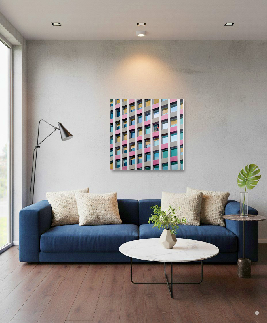 Het regelmatige patroon van een flatgevel wordt onderbroken door een mevrouw die haar geraniums water geeft.