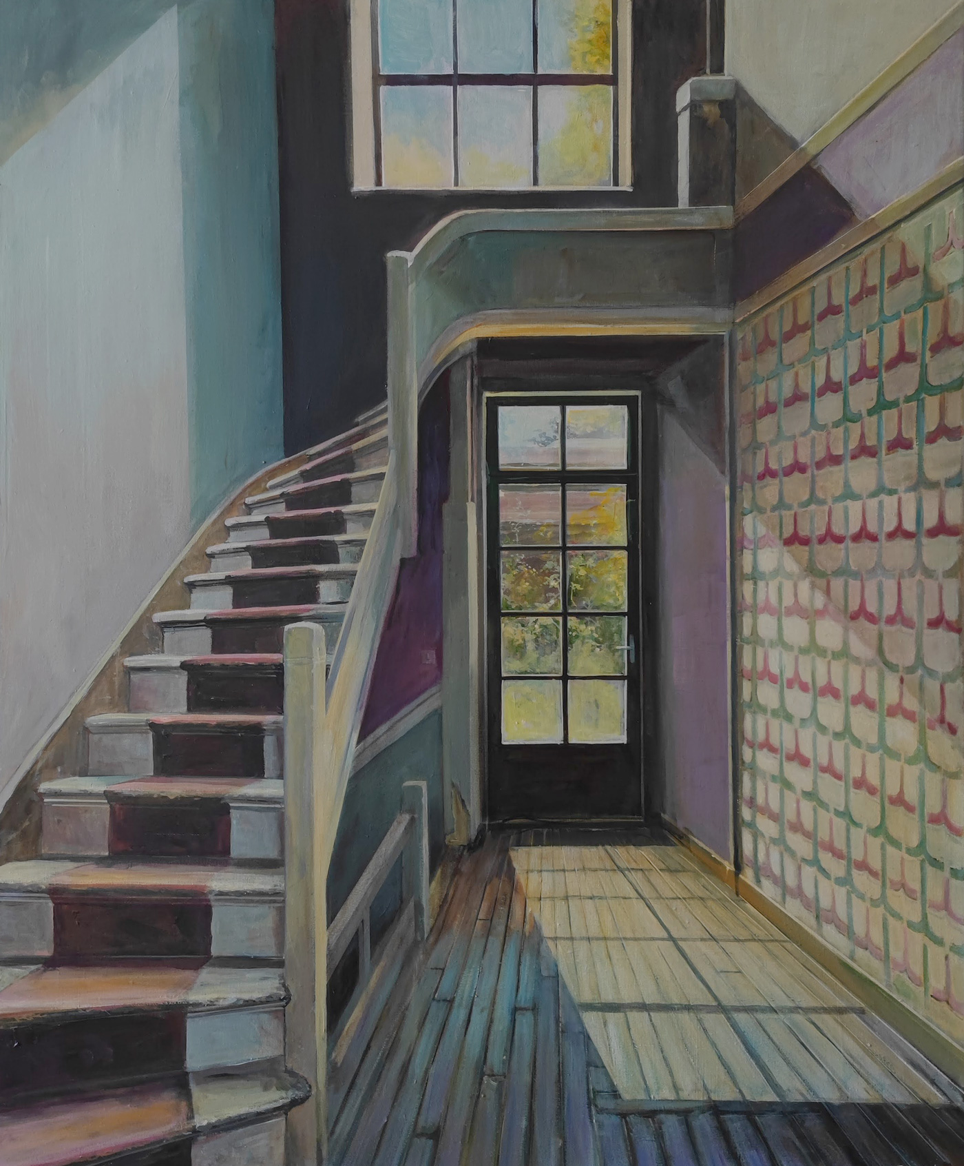 Het zonlicht valt binnen in het trappenhuis van een mooi oud huis dat wacht op nieuwe bewoners.