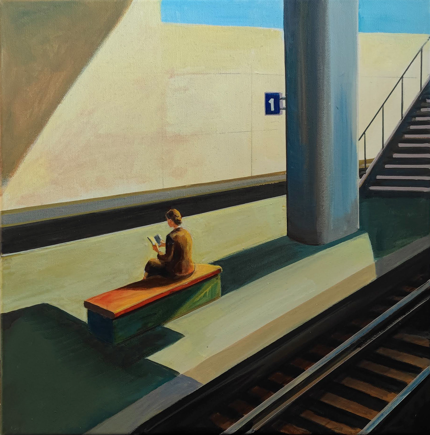 Een reiziger zit te lezen op een zonnig perron, in afwachting van de trein.